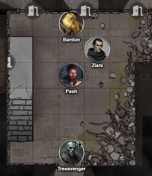 We manage to dispatch them and can examine the room in more detail. We find 100s of name plates across the walls. Treeavenger finds a secret door on the right.