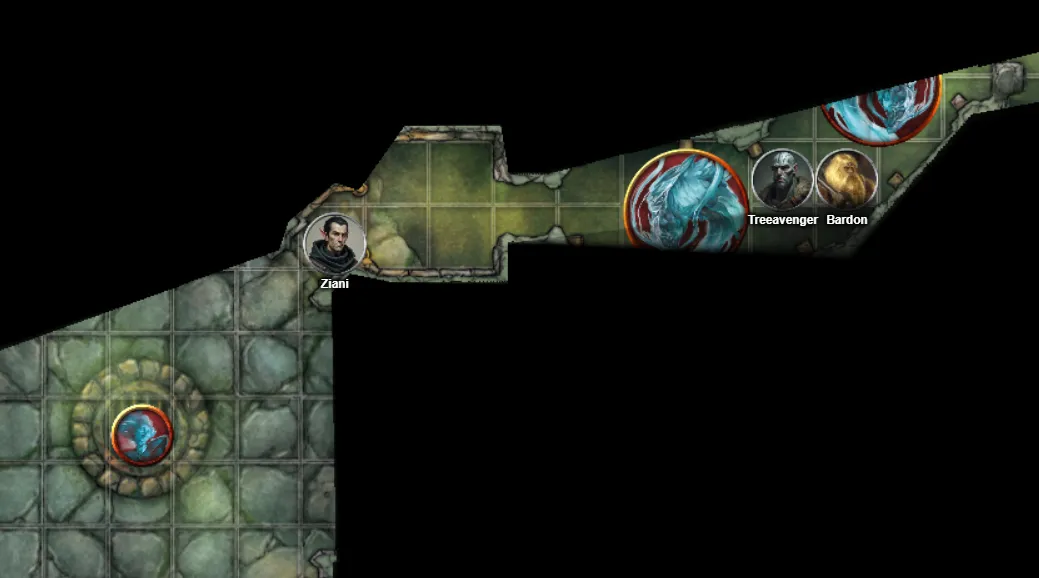 I enter the room. The room is covered in serrated blades. They slash at my skin as I try to approach. I aggro the creature and hurry back out of the room. Treeavenger gets grappled and dragged into the room, suffering significantly for it.