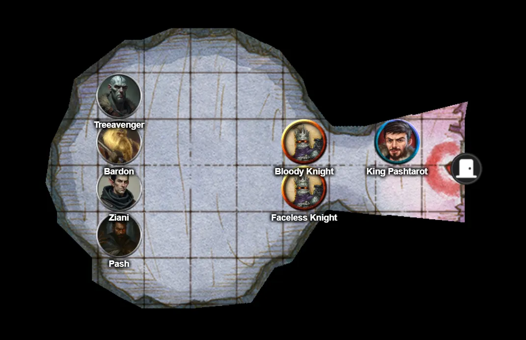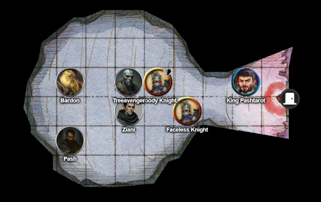 We find reflections of ourselves in the door - approaching us. The visage of our dream selves approach. Bardon’s, mine, and Treeavenger’s turn to dust before reaching us. But the visage of Pash exits the mirror and accosts us with two summoned knights.