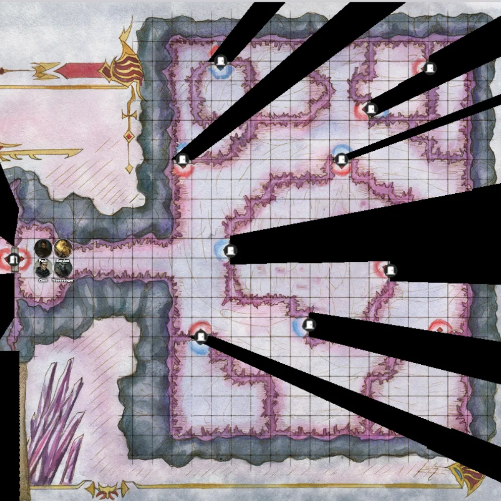 We enter the next room which is reverberates with a dangerous hum. Thanks to the power granted to us from the secrets we gathered, we can see through the walls and where each crystal leads.