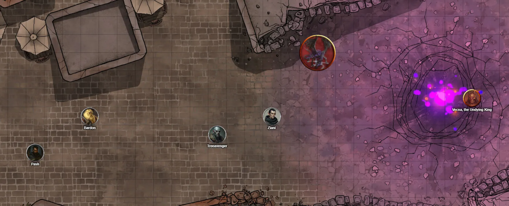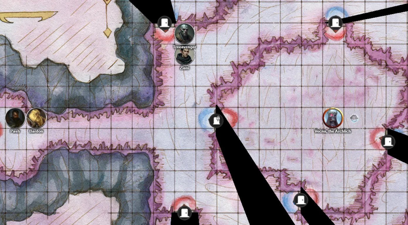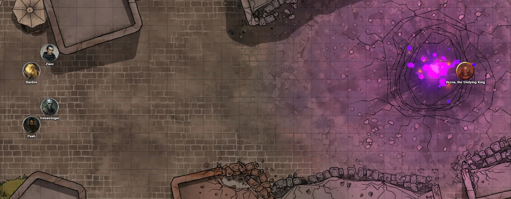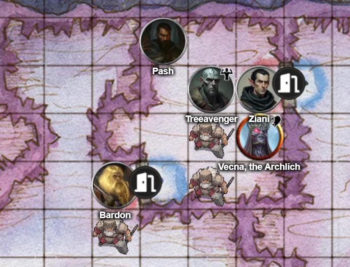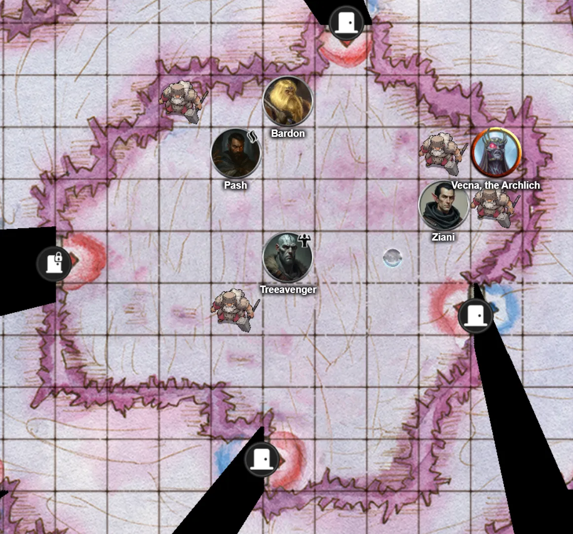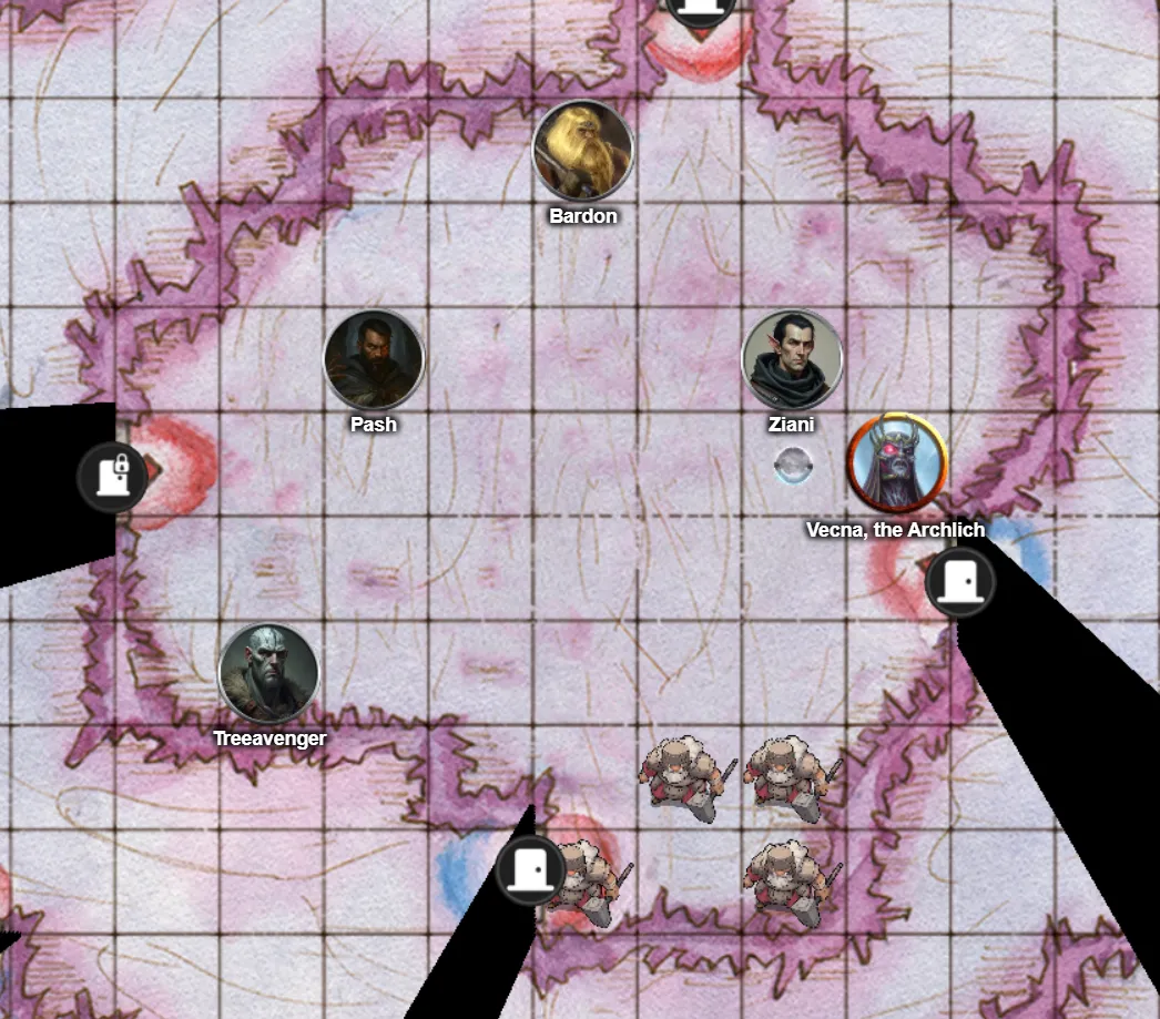 Treeavenger summons the warriors from the Horn of Valhalla. Vecna teleports away from the summons and I strike at him. Pash strikes at him and Bardon heals me. Vecna strikes at me to little success, before teleporting to Bardon and healing himself.