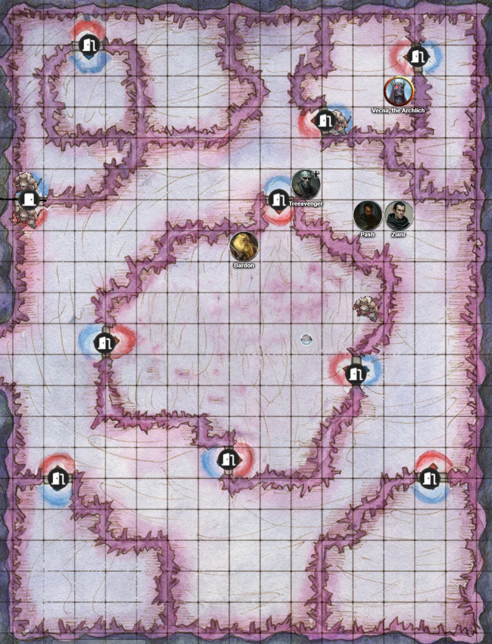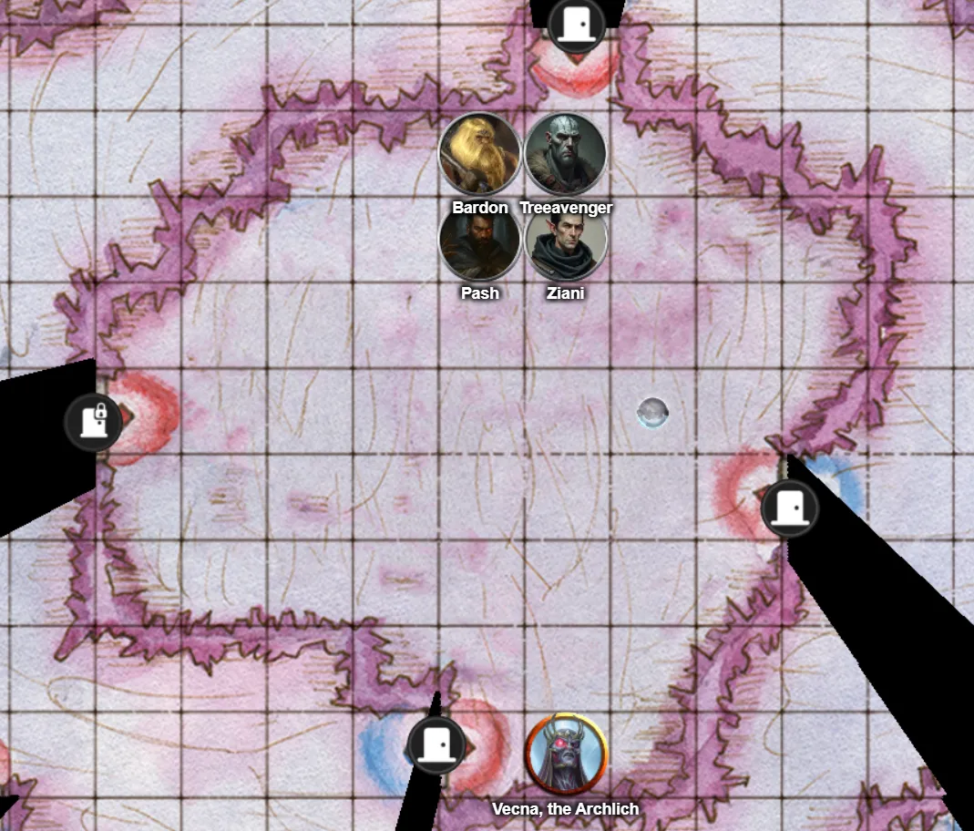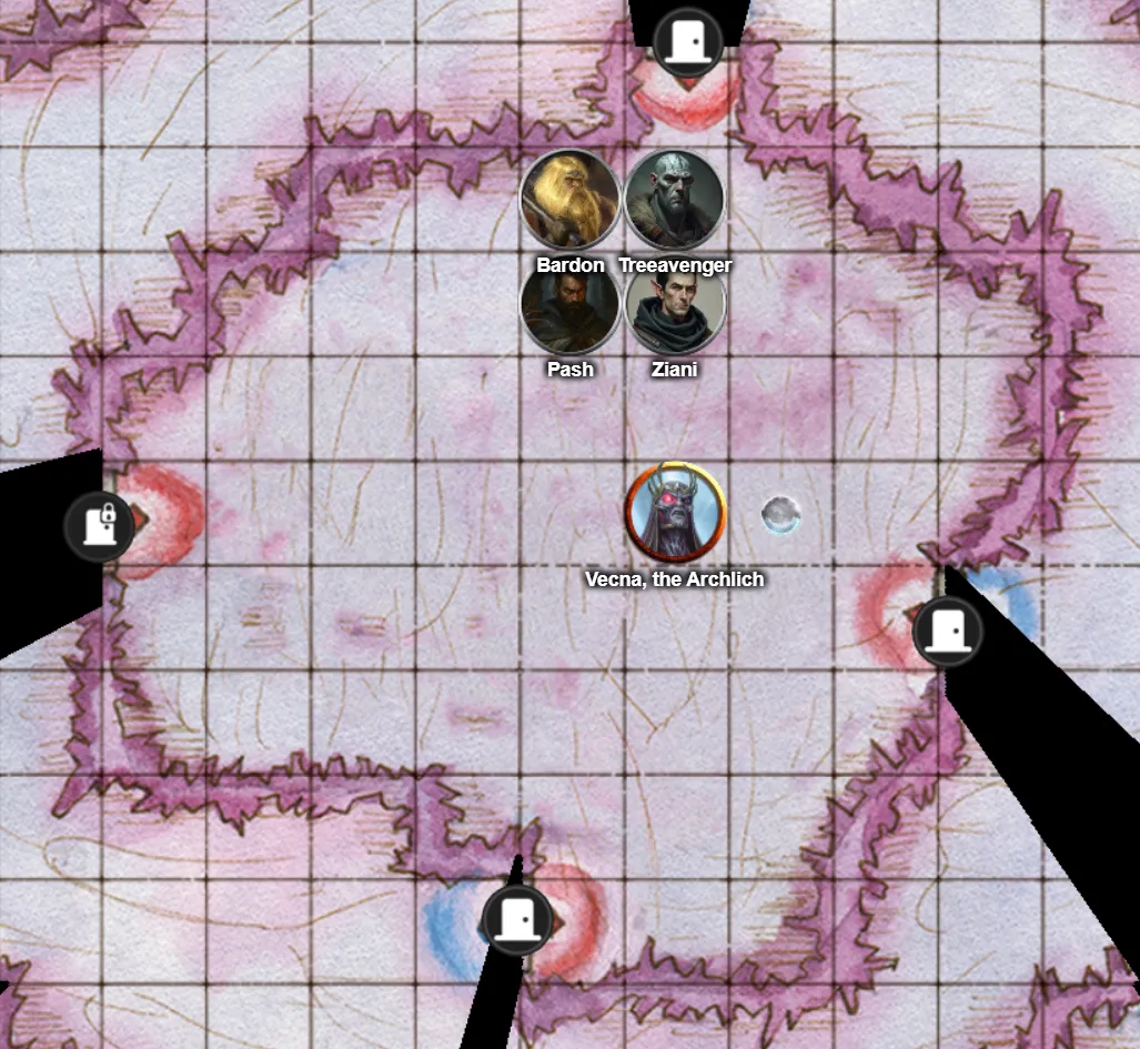 Treeavenger tests one door and ends up in the room in the South East. Then finds the North door leads to Vecna.